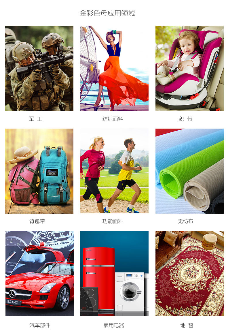 應(yīng)用范圍:家用電器、汽車部件、生活用品、玩具等。適用包括:聚丙烯(PP)、聚乙烯(PE)、通用聚苯乙烯(PS)、丙烯腈-丁二烯-苯乙烯(ABS)、聚對苯二甲酸丁二醇酯(PBT)、聚對苯二甲酸乙二醇脂(PET)、聚碳酸酯(PC)、聚酰胺(PA)、乙烯-醋酸乙烯酯(EVA)、聚氯乙烯(PVC)、聚氨酯樹脂(PU)、聚甲苯(POM)等。