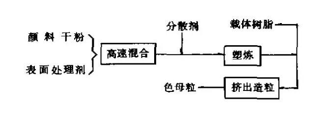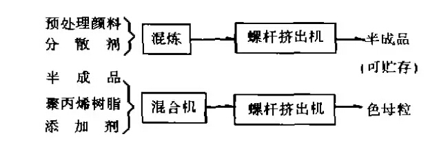 這種色母粒生產(chǎn)所使用的顏料必須經(jīng)過顏料細(xì)化和表面處理 ,制得的色母粒才能具有好的內(nèi)在質(zhì)量。這種生產(chǎn)方法的優(yōu)點是流程簡單,見圖 2 。設(shè)備固定投資少,缺點是可供選擇的顏料不全面。生產(chǎn)的靈活性受到了限制,而且對顏料的粒度不能控制 。