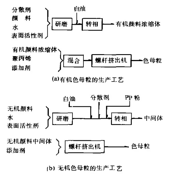 本方法的缺點是生產(chǎn)設(shè)備固定投資少,操作要求高;顯著的優(yōu)點是具有對顏料粒度的控制能力,能夠選擇顏料干粉并使之經(jīng)過處理后獲得優(yōu)越的著色力、不透明性及其它光學(xué)特性,同時能適用于對顏料粒度要求很高的細(xì)旦丙綸的生產(chǎn),也就是說能生產(chǎn)出高品質(zhì)的色母粒。