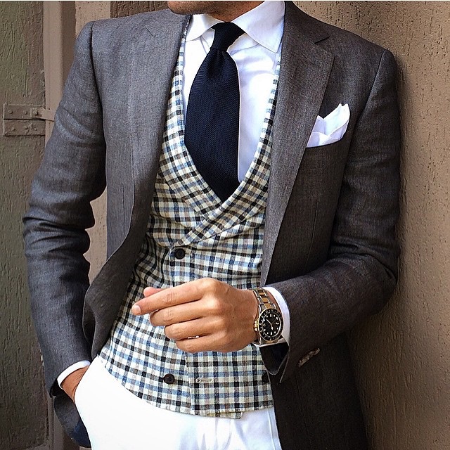 傳統(tǒng)的西裝時(shí)尚搭配是白色或淺藍(lán)色襯衫配單色或有明亮圖案的領(lǐng)帶,這是永不過(guò)時(shí)的搭配,而且適合任何場(chǎng)合。正規(guī)的西裝應(yīng)該是三件套,包括外套、長(zhǎng)褲和背心。
