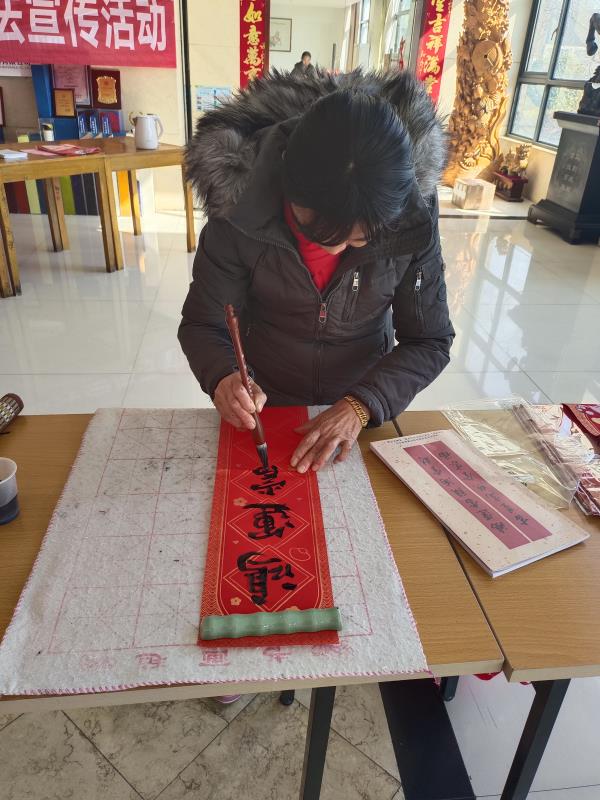“金龍送福年年順,運轉(zhuǎn)乾坤步步高”“九域龍騰歡盛世,三春燕舞樂清風”……不一會兒,一幅幅滿載新春祝福、寓意美好前景的春聯(lián)、“福”字躍然紙上。